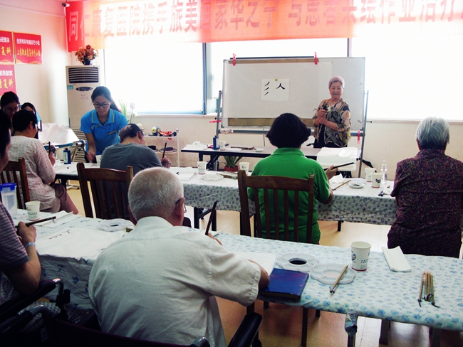下午两点,20病区活动室内,黄君璧入室弟子、著名画家华之宁给康复患者现场授课。8名康复患者在作业治疗师的陪伴下认真学艺,铺开宣纸、倒上墨汁、拿起毛笔,饶有兴趣地听着华老师的讲解。病员们虽然因为病痛,有些手歪着,有些手微微颤抖,但在华之宁的鼓励、康复治疗师的指导下,努力坚持着,落笔、行笔,对绘画的兴趣也愈发浓厚起来。结束时,病员们拿着各自的作品,颇有成就感。“通过一段时间的康复训练,我右肘关节功能大大改善,没想到在华老师的指导下,我居然可以画得这么好,下次有这样的活动,我还参加”看着自己的水墨涂鸦,患者杨女士这样说。