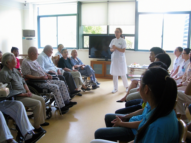 “东方红,太阳升,中国出了个毛泽东……”下午两点半,18病区活动室内,10名参加过抗战的住院康复患者及20余名轮盘在线 党团员医务人员激情洋溢地唱起了一曲《东方红》,抗战老兵们回忆起一幕幕激情燃烧的岁月。他们中有的参加过抗日战争,获得过“刘伯承章”,有的参加过珍宝岛战役、炮击金门战役,有的参加过朝鲜战争、解放战争,有着“双枪老太婆”称号。他们的到场,得到全场医务人员由衷的敬意。面对穷凶极恶的日本侵略者,老兵们不同的亲历反映出当时全民抗战、救亡图存的中华民族誓死抵抗的民族气节,在场听众无一不受到震撼和鼓舞。许多革命前辈还带来了他们的军功章,医务人员纷纷与革命前辈合影,共同分享纪念抗战胜利70周年蛋糕,团员青年们还向他们送上绿色长青植物,祝他们健康长寿。