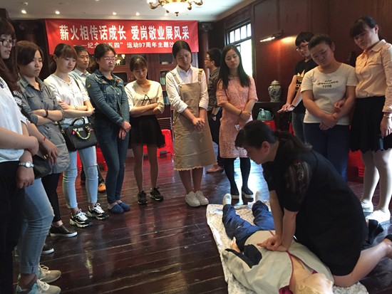 技能展示篇:院青年岗位能手梁成盼治疗师就“颈椎病康复”做现场展示,他通过颈部上、下、左、右、手臂背伸等几个动作很快判断出青年的颈部功能受限问题,并现场进行康复手法展示。“仅仅几分钟我的颈部不适问题就解决了”一位青年欣喜地表示。梁成盼治疗师还现场传授了简易颈椎操的要领,他建议青年团员要放下手机,不要做个低头族,才能促进颈椎健康。接下来,院青年岗位能手吴惠红护士长为大家进行心肺复苏技能展示。吴护士长从判断意识开始,示范了心肺复苏的标准流程,着重讲解了复苏中的注意事项,并现场传授了昏迷患者迅速开放静脉通道的方法。她强调心肺复苏流程是固定不变的,但遇到实际病人一定要灵活运用,因人而异。展示活动结束后,青年团员与岗位能手进行了互动,青年团表纷纷表示技能展示活动对青年团员自我保健意识以及急救技能的提升发挥了积极作用。