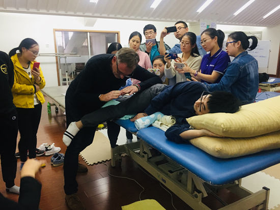 Christoph Hofstetter 教授授课时幽默风趣。在课程中,导师对一名神经系统患者进行分析评估和治疗演示。手把手教学让学员们感受到了新Bobath的魅力。学员们互相交流沟通,不断向导师提问探索知识,充分掌握分析思维过程,Bobath概念中特定的和基础的治疗技术,和对神经系统患者神经肌肉分析的理论与实践知识。