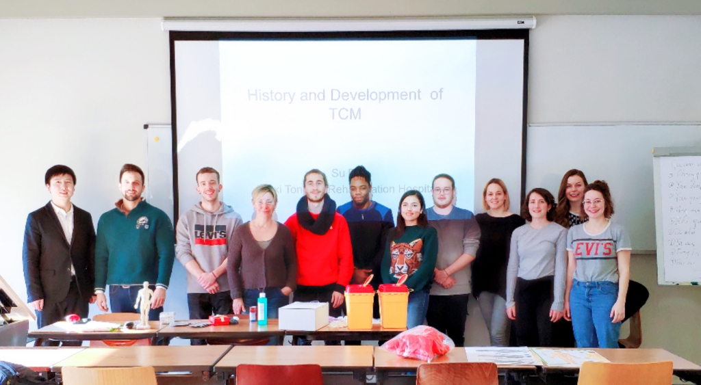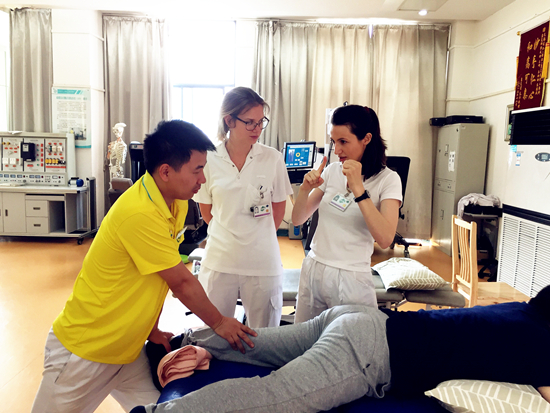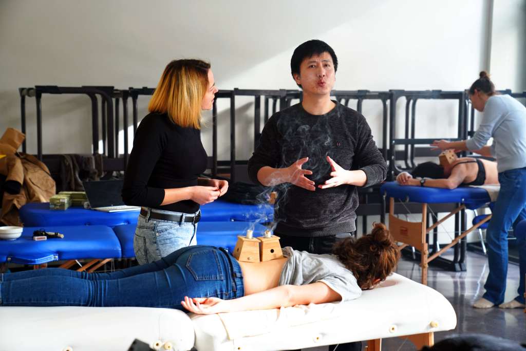 交流期间,苏彬用英语向瑞士的师生介绍了中国康复医学发展现状,详细讲解并演示了中国传统康复医学(Traditional Chinese Medicine,TCM)的发展现状、基础理论和实践技能,包括阴阳学说、五行学说、藏象学说和经络。学院的教授和学生们表示对中国传统康复医学非常感兴趣,课堂互动交流气氛活跃。一些学生感言:“中医是如此的神奇!”