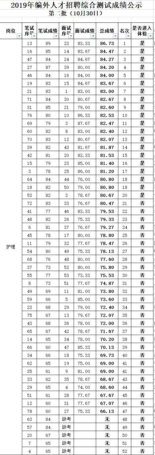 2019年编外人才招聘综合测试成绩公示 第二批(10月30日)
